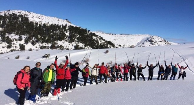 Yukarıbayır Köyü’nde bir araya gelen 26 kişilik grup buradan yaklaşık 15 kilometrelik yürüyüş yolunu tamamlayarak bin 800 metre rakımdaki Holduca Tepesi’ne ulaştı. Diz boyu karla kaplı parkuru tamamlayan doğa severler, karın doğayla bütünleşen güzelliğini fotoğrafladı