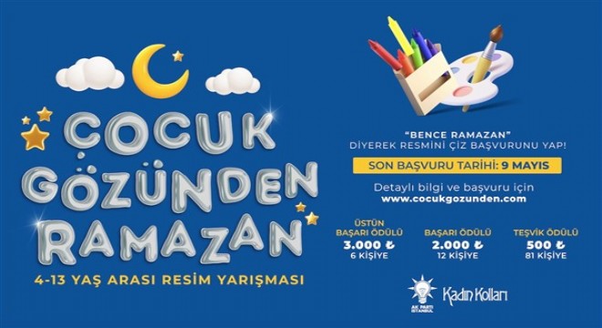 AK Parti İstanbul İl Kadın Kolları Başkanlığı tarafından düzenlenen 3. Geleneksel Çocuk Gözünden Ramazan temalı resim yarışmasına başvurular başladı. Çocukların, ramazan coşkusunun eve yansıyan hallerini resimle anlatması için gerçekleştirilen resim yarışmasına 4-13 yaş arası tüm çocuklar başvurabilecek. Dereceye girenler büyük ödüllerin de sahibi olacak.