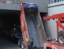 Kızılay Meşrutiyet Caddesi Konur Sokak'ta, 06 AT 6785 plakalı tırın taşıdığı 06 AT 3716 plakalı vinç, üstgeçide sıkıştı.