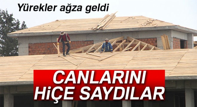 Aksu ilçesinde bir okulun bahçesinin içerisinde yapımı devam eden 4 katlı binanın çatısında çalışan işçiler güvenlik önlemi almadı. İşçilerin, kendilerini çatıya bağlamadan çalışması çevredekilerin yüreğini ağzına getirdi. Binanın çatısında rahat tavırlarıyla dikkat çeken işçiler adeta ölüme davetiye çıkardı.