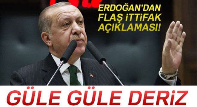 "Biz Afrika’dan Afrin’e kadar ülkemizin geleceği için her yerde ve her konuda yoğun bir mücadele yürütürken maalesef ülkemizde giderek çapı ve seviyesi düşen bir ana muhalefet gerçeğiyle karşı karşıya olduğumuzu görüyoruz" diyen Erdoğan, "Her defasında acaba bu sefer farklı olabilir mi diye ümit ediyoruz. Ama ülkemizin ve milletimizin bekasını ilgilendiren her kritik konuda bu partinin yanlış tarafta bulunduğunu görmekten üzüntü duyuyoruz. Siyasi partilerin seçimlere ittifakla girebilmelerini temin için ilgili kanunlarda değişiklik yapılması konusundaki düzenleme sırasında da benzer bir manzarayla karşılaştık. Seçimlere ittifakla girilebilmesi hususu ne AK Parti’ye ne başka partiye münhasır değildir. Bu daha önce farklı şekillerde uygulanmadı mı? Uygulandı. İlk defa yapılmıyor. Arzu eden tüm partiler aralarında böyle bir ittifak kurabilirler. Cumhurbaşkanlığı seçimlerinde zaten doğal olarak gerçekleşecek bu ittifakın milletvekilliği seçimlerine teşmili yürütme erkinde sağladığımız istikrarı yasama organında da mümkün kılacak bir imkandır. Bu işin bir başka faydası da geçmişte kimi seçimlerde zaten yapılan ama adeta hülle yönetimi kullanılan seçim ittifaklarının hukuki zemine kavuşturulmasıdır.