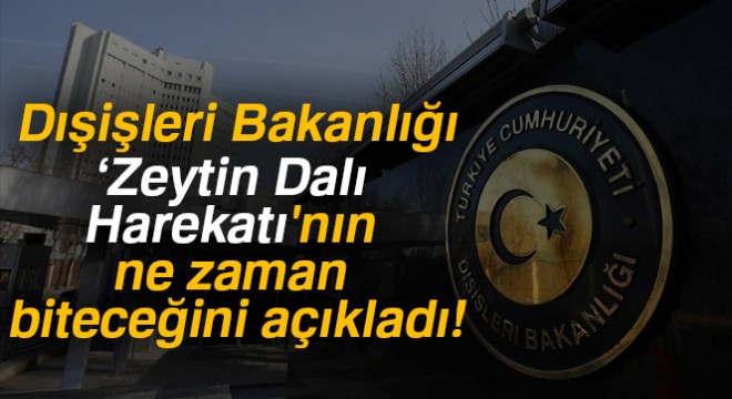 Dışişleri Bakanlığı Zeytin Dalı Harekatı'nın ne zaman biteceğini açıkladı. Dışişleri Bakanlığı'ndan yapılan açıklamaya göre harekatında Mayıs ayında bitebileceği belirtildi.