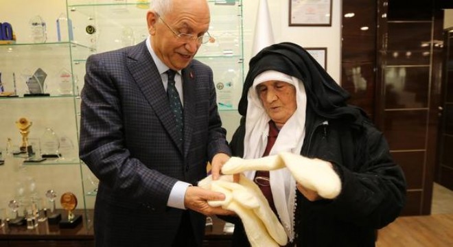 Ayakların üşümesin” diyerek, Başkan Yaşar’a ördüğü çoraplardan hediye etti.