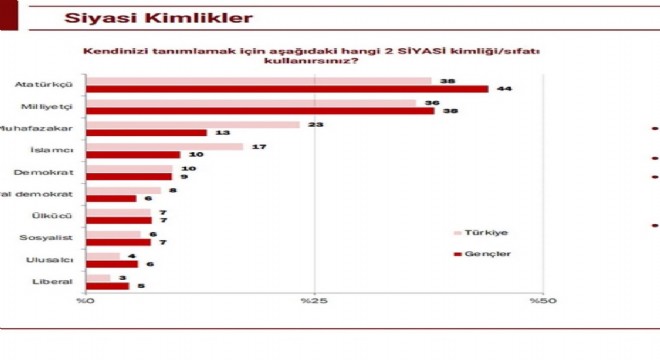 KONDA’nın yaptığı son araştırmaya göre, Türkiye’de vatandaşların kendilerini tanımladığı siyasi kimlikler arasında Atatürkçülük ve Milliyetçilik ön plana çıkıyor. Özellikle gençler arasında bu kimlikler daha belirgin şekilde tercih ediliyor. Türkiye genelinde katılımcıların %38’i kendilerini Atatürkçü olarak tanımlarken, gençler arasında bu oran %44’e yükseliyor. Aynı şekilde, milliyetçi kimlik genel olarak %36 oranında tercih edilirken, gençlerde bu oran %38 olarak görülüyor.