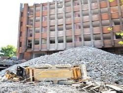 İstanbul Caddesi’nde bulunan binanın yıkımı için 8 katlı binanın tepesine kırıcı bir iş makinesiyle kepçe tabir edilen iş makinesi çıkarıldı.