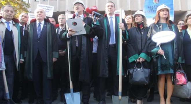 AnkaraBarosu’na kayıtlı avukatlar, kentin adliye sorununu, temsili temel atma töreniyle protesto etti. Dün, Ankara Adliyesi’nin önünde toplanan avukatlar, “Bir tek adliye istiyoruz”, “Aklın yolu 1 adliye” ve “Başkent’e yakışır tek adliye” yazılı dövizler taşıdı, “Adalet bütündür, parçalanamaz”, “Adalet Bakanı sözünü tut”, “Adalet Bakanı, bir kazma da sen vur” diye sloganlar attı.Başına baret takıp, eline kürek alan Ankara Barosu Başkanı Hakan Canduran, yaptığı açıklamada, özetle şunları söyledi:“Ankara’da adalet, şehrin dört bir yanına savrulmuş, parçalanmış, adalet dağıtmak için dizayn edilmemiş otel binalarından devşirme yapılar içerisine hapsedilmiştir. Başkentimizde adalet, 10’u aşkın parçaya bölünmüş durumdadır. Başka hiçbir ilde örneği görülmeyen bir şekilde Ankara’da, aynı yargı koluna dahil mahkemeler bile fiziken farklı yerlerde bulunmakta. Taşınma ve kira maliyetleri düşünüldüğünde yeni bir adalet sarayı yapmak yerine bina kiralama yoluna giden Adalet Bakanlığı’nın bu tutumunu anlamak, mümkün değildir.