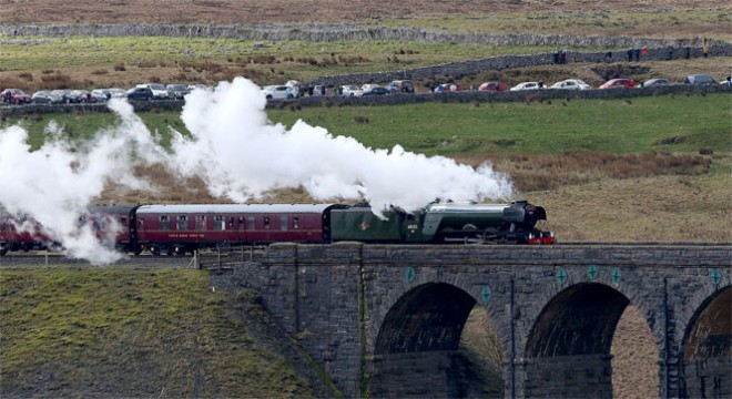 Uçan İskoçyalı buharlı lokomotif Settle ile Carlisle hattındaki Ribblehead viyadüğünden geçerken, onlarca araç kara yoluna sıralanarak bu geçişi seyretti.
